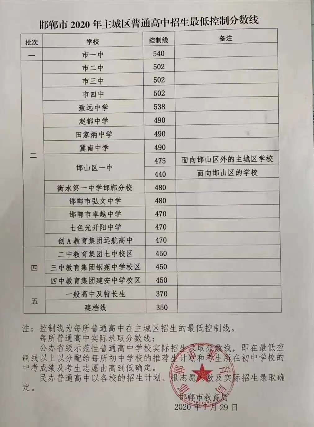 邯鄲市2020年主城區普通高中招生最低控制分數線